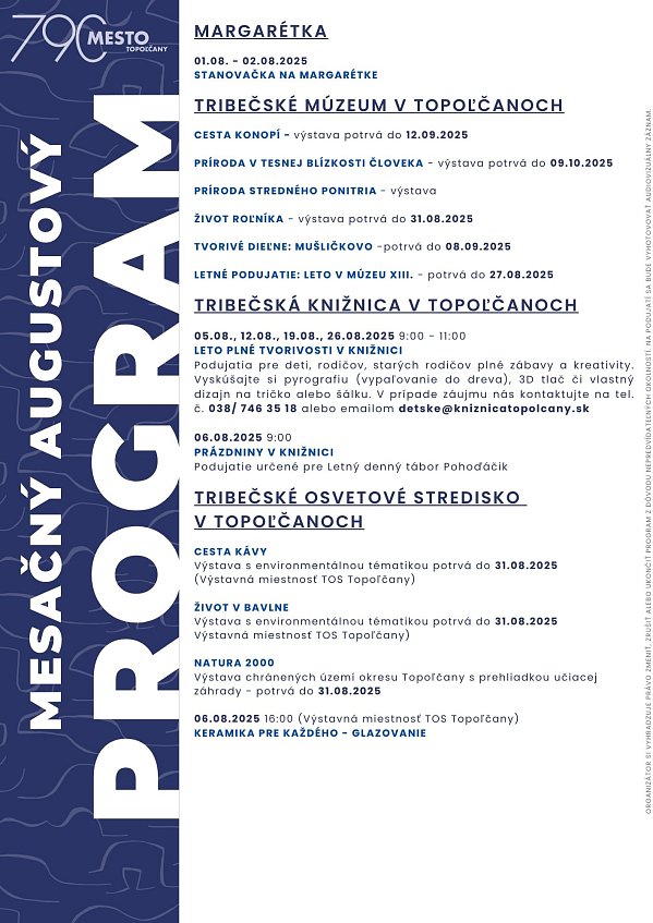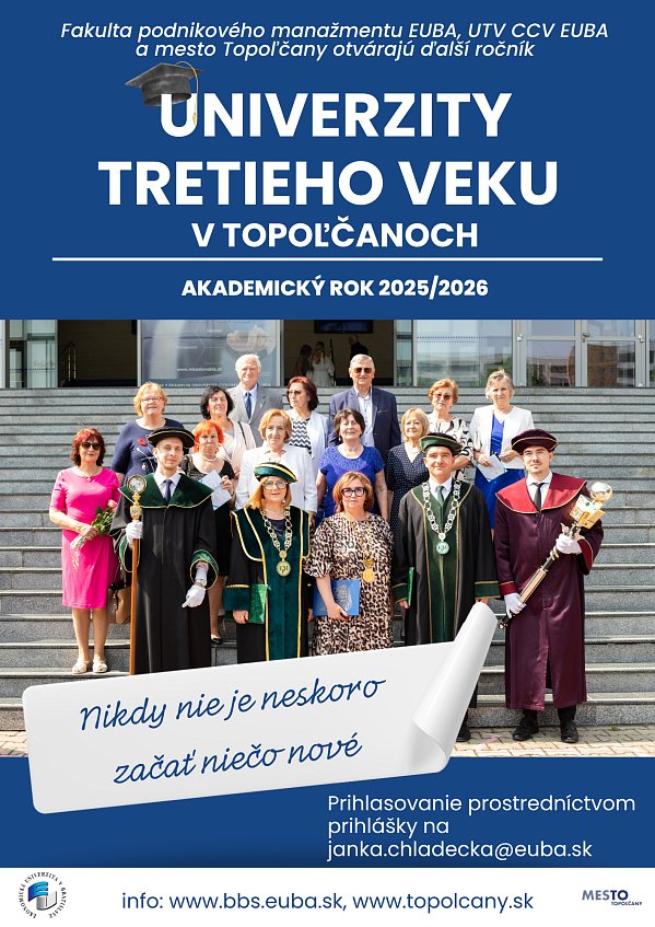 Teší nás záujem topoľčianskych seniorov o štúdium na Univerzite tretieho veku. Preto v spolupráci s Fakultou podnikového manažmentu EUBA otvárame túto možnosť pre ďalších záujemcov aj v roku 2025/2026. Tešiť sa môžete na sériu zaujímavých prednášok s praktickým využitím v každodennom živote. Prihláste sa vyplnením prihlášky do 31. augusta 2025. | |